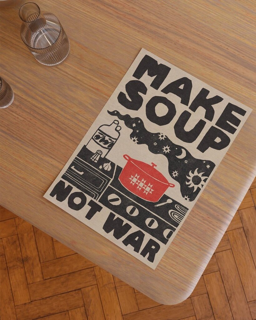 Bring warmth, peace, and comfort into your home with Make Soup Not War, a bold, hand-drawn protest art print in a modern folk-art style.