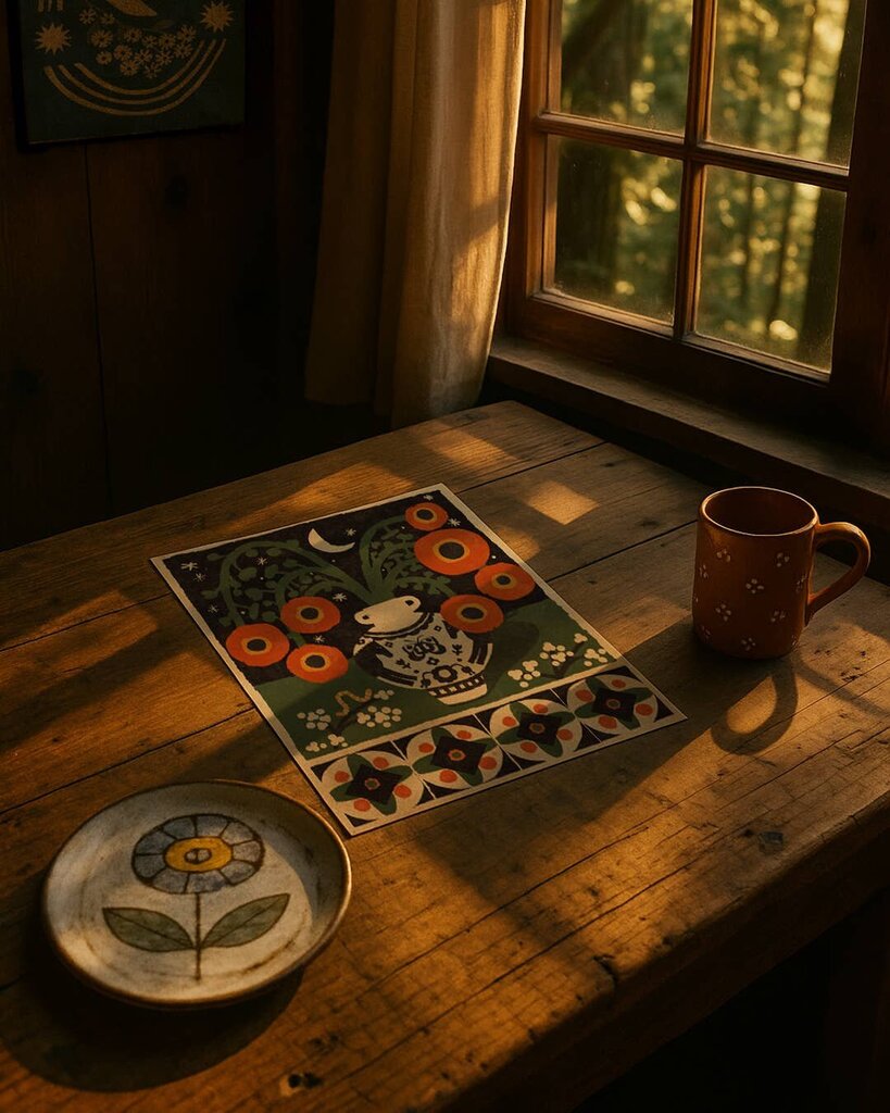 Anisa Makhoul is an artist living and working in a treehouse in the old-growth forest of Oregon. Her work is shaped by themes of home, beauty, comfort, magic and liberation. She makes art that’s meant to live with people. She believes everyone deserves beauty in their home, not as a luxury, but as something grounding, sustaining, and quietly powerful. Her images are often whimsical and magical, using familiar symbols and warm color to create a sense of ease and belonging. The work exists first as art. Prints, stickers, and mugs are simply ways the work moves around the world. At its heart, her work is about creating small moments of comfort and freedom, art that feels like home.