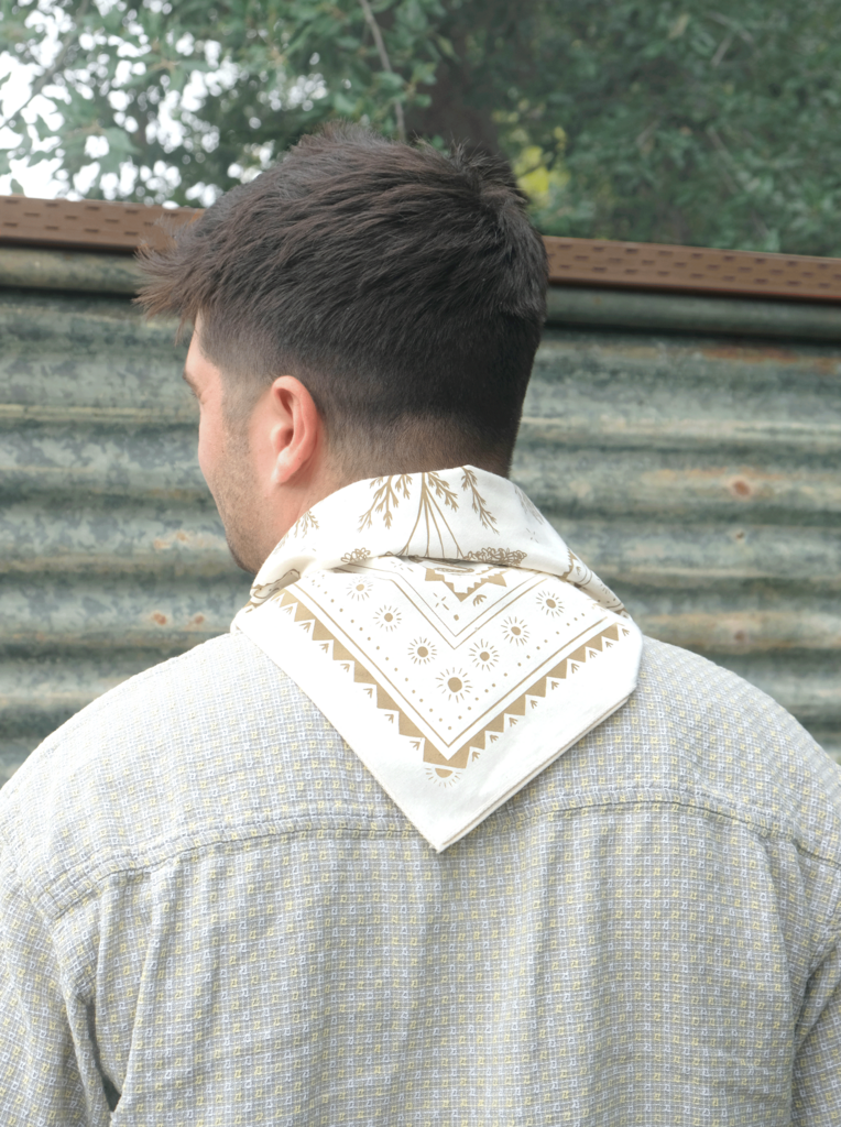The High Desert Bandana is an homage to the rugged beauty of western and southwestern landscapes, celebrating the medicinal plants and the creatures that thrive under the desert sun. Featuring Yarrow, Juniper, Sagebrush, and Mullein surrounded by stones, cracked earth, and radiant sun motifs.