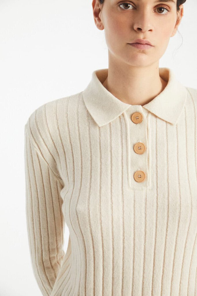 A timeless rib-knit polo sweater with wooden buttons from Spanish slow-fashion house, Rita Row.